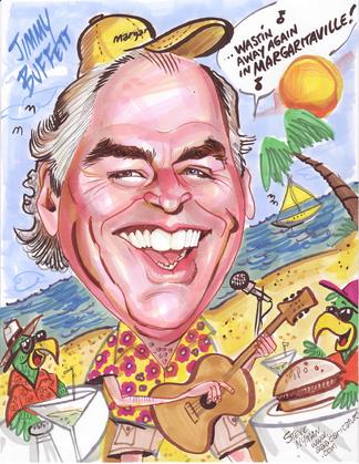 Caricature of Jimmy Buffett created by cartoon artist and caricaturist Steve Nyman. Buffett’s Florida key’s sound has the following of fans called Parrotheads. Jimmy’s songs include, Margaritaville, Cheeseburger in Paradise and the Alan Jackson duet of Five O’Clock somewhere. His laidback sounds are heard on radio stations all over the country. Jimmy Buffett has opened his own restaurants called Margaritaville in Universal Studios Florida.